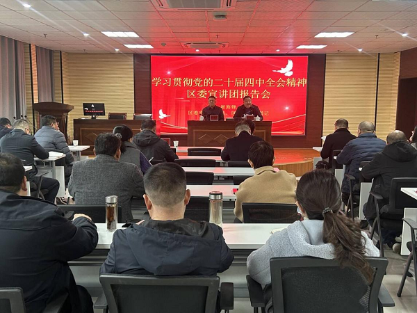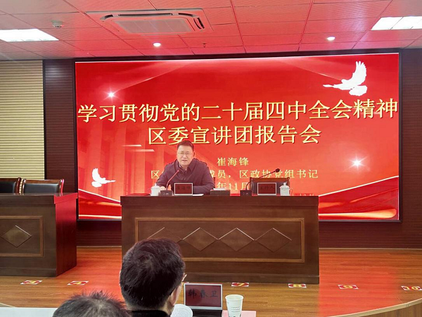 11月28日上午,區(qū)政協(xié)黨組書(shū)記崔海鋒同志赴集團(tuán)開(kāi)展學(xué)習(xí)貫徹黨的二十屆四中全會(huì)精神宣講活動(dòng),區(qū)政協(xié)秘書(shū)長(zhǎng)兼辦公室主任韓春衛(wèi)同志陪同參加。宣講會(huì)由集團(tuán)黨委書(shū)記、董事長(zhǎng)滕鋒同志主持,集團(tuán)全體黨員及中層以上管理人員參加。